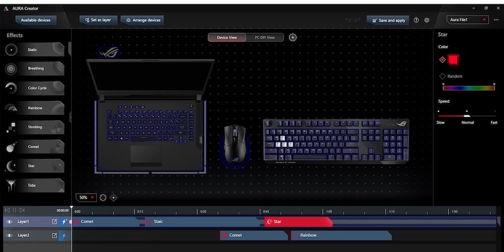 ROG standında, Aura Creator (beta) ile tasarlanan ve kontrol edilen ışık gösterilerine sahip iki demo oyun sistemi yer alıyor. Bunlardan ilki, güçlü ROG Strix Scar III dizüstü bilgisayar ile oluşturulan bir sistem. Karmaşık bir RGB düzeni; ROG Delta oyuncu kulaklığı, ROG Gladius II Origin optik oyuncu faresi ve ROG Balteus Qi RGB mouse pad üzerinde devam ediyor. Diğer sistem ise en yeni 3. Nesil Ryzen işlemcileri destekleyen ROG Strix X570-E Gaming anakarta sahip bir masaüstü bilgisayar.