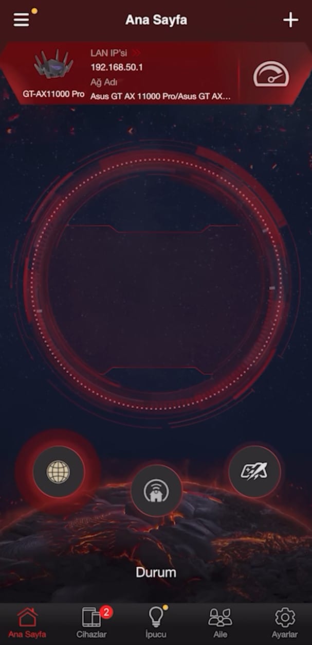 ASUS ROG Rapture GT-AX11000 PRO modelinde yazılım desteği kısmında güzel bir mobil uygulama öne çıkıyor. Hem Android hem de iOS için kolay kurulum sunan mobil uygulamaya erişim de olduka kolaylaştırılmış. Akıllı telefonunuzdan QR kodu okuttuğunuz zaman, kolay arayüz üzerinden kurulumu gerçekleştirebiliyorsunuz. Bunun dışında uygulama üzerinde hemen hemen tüm ayarları yapmanız mümkün. Cihazın anlık RAM ve CPU kullanım bilgilerine ulaşma, ağ durumunu görüntüleme, ağda bağlı olan cihazları görme, oyun moduna geçiş, entegre olarak hız testi yapma gibi ayrıcalıklar var. Kullanımı oldukça kolay olan uygulamanın, arayüzünün de Türkçe olmasının bir avantajı olduğunu da söylemek lazım.