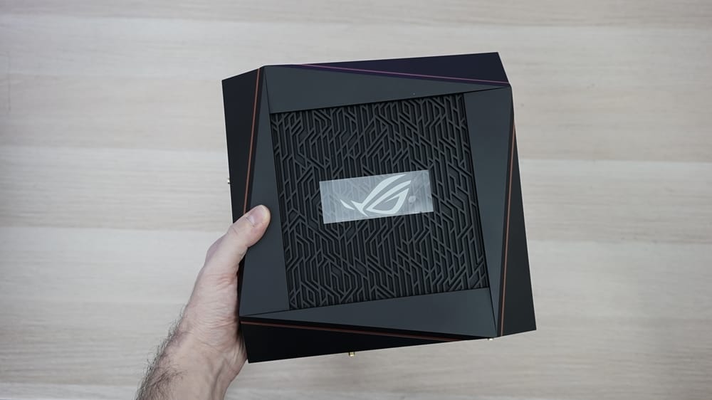 Tasarım noktasında Router, ASUS ROG çizgisini en iyi şekilde yansıtmış diyebiliriz. Kuş bakışı kare görünüme sahip olan Router, her kenarı paralel kesen şık detaylara sahip. İnce işçilik ile hazırlanmış ızgaralı üst panel ve ROG gözü ile birlikte kaslı ve asi bir görüntü sunan Router, ROG serisinin hakkını veren bir görüntü sunmakta.