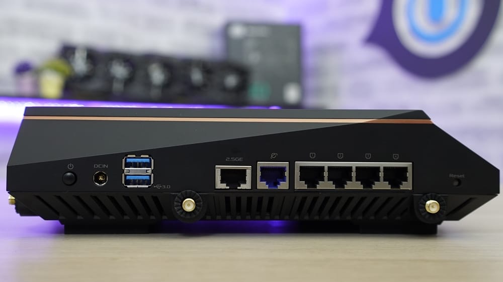 Öte yandan modemin arka kısmı, diğer kenarlara göre daha dikkat çekici. Açma kapatma ve Reset düğmesine ek iki adet USB 3.1 portu, 4 adet RJ45 LAN portu, iki adet WAN portu ve güç girişi bulunuyor.