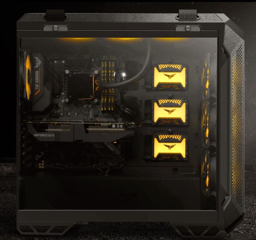 Genel tasarıma baktığımız zaman ise yan kısımda isli bir temperli cam kullanıldığını görüyoruz. Tamamen bu bölümü kaplayan cam, ASUS TUF GT501 serisinin, içinin gözükmesini sağlıyor.