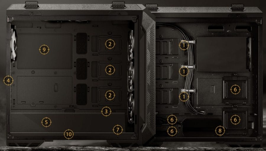 Ayrıca ek fan yükseltmesi isteyenler için 7 adede kadar da ek fan kullanmak mümkün. Radyatör kapasitesine gelince ASUS TUF GT501, hem önde hem de üst kısımda 360 mm sıvı soğutmalı radyatöre destek vermekte. Arkada ise 140 mm’lik bir radyatör desteği var.