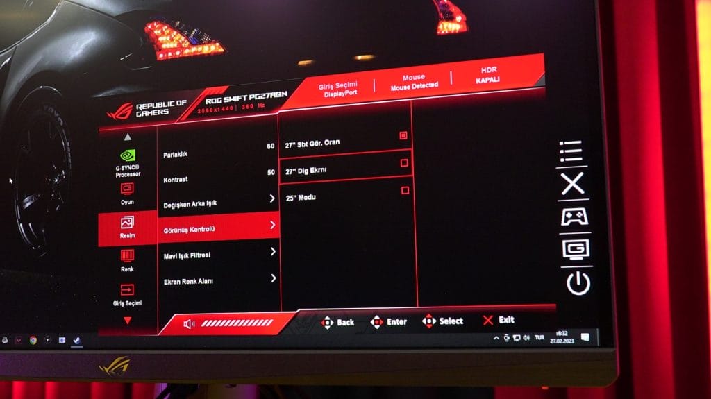 ASUS ROG Swift PG27AQN monitörde dikkat çeken bir diğer önemli özellik çift ekran modu. Normalde monitör 27 inçlik bir panelle geliyor. ASUS, espor oyuncularının biraz daha küçük ekran kullanmak alışkanlıklarını da göz ardı etmek istememiş.