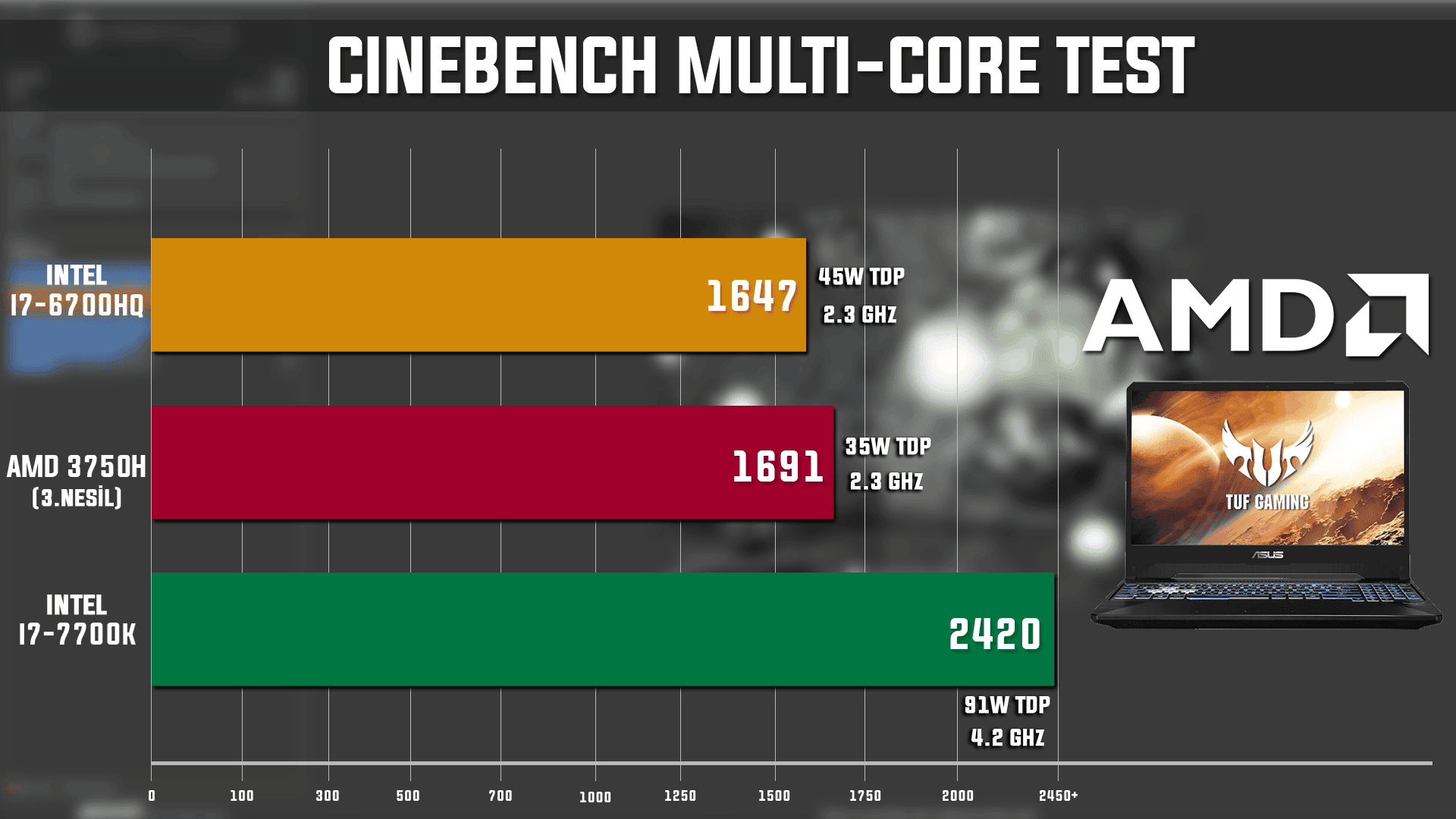 ASUS TUF FX705 laptopun içerisinde AMD'nin 3. nesil Ryzen işlemcisi bulunuyor. Ryzen 3750H modeli olan bu işlemci, dört çekirdek ve 8 izlek ile geliyor. 12nm ile Zen+ mimarisi etrafında şekillenen işlemci, 35W değerindeki düşük güç tüketimi ile temelde 2.3GHz, Turbo da ise 4.0GHz saat hızına ulaşabiliyor. Normal şartlarda harici bir ekran kartına gerek de duymayan işlemcinin dahili bir Vega 10 grafik işlemcisi de mevcut.