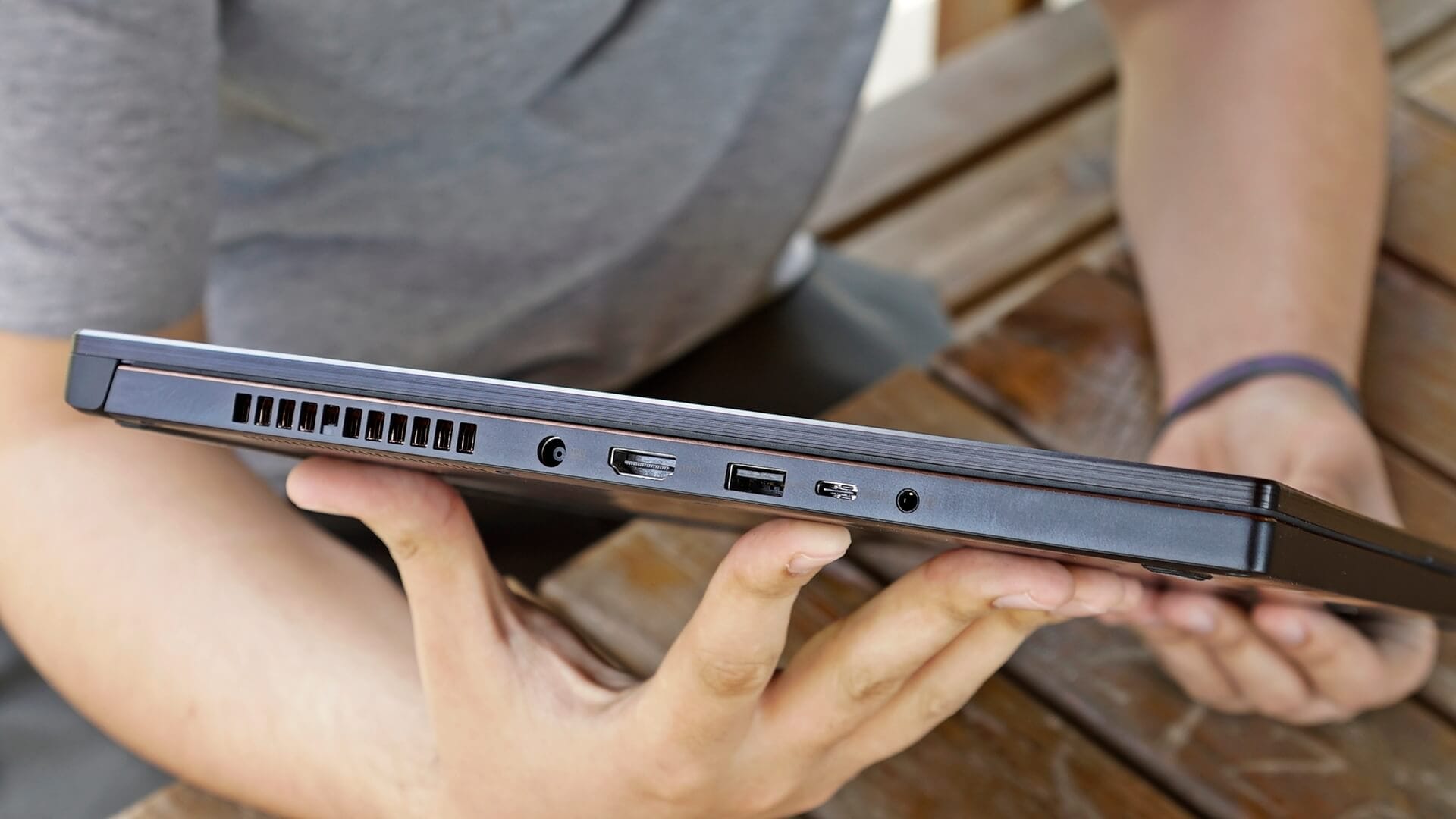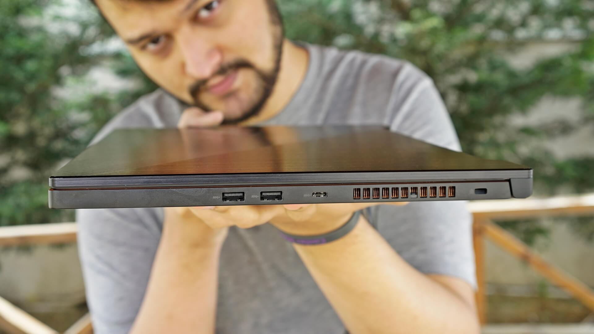 ASUS Zephyrus S'in giriş çıkış portlarına baktığımızda sol bölümde sırasıyla güç girişi; HDMI, USB 3.1, Type-C ve mikrofonlu kulaklık jackı bulunuyor. Sağ kenarda ise iki adet USB 3.1 ve ikinci bir Type-C yuvasu bulunmakta. Ayrıca cihazın sağ, sol ve arka kısımlarında havalandırma kanalları da mevcut.