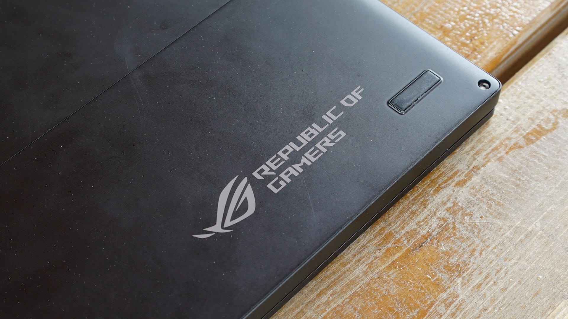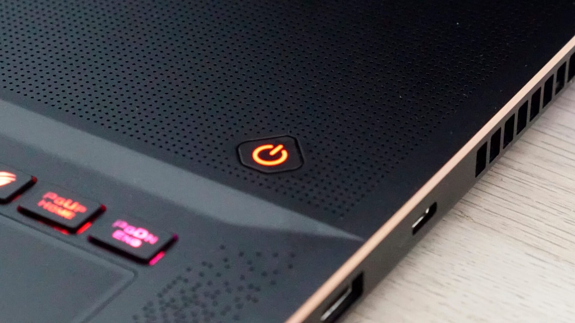 Laptop, fırçalı mat siyah bir renk tonuna hakimken çerçeve ve ince detaylarda altın renkli süslemeler görüyoruz. Altın rengini laptopun çeşitli noktalarına ekleyen ASUS, aynı zamanda laptopu saran bir şerit ile premium tasarımı güçlendirmiş. Arka panelde alıştığımız ROG logosu bulunurken, kapağı kaldırdığımızda alışılmışın dışında bir klavye tasarımı ile karşılaşıyoruz.