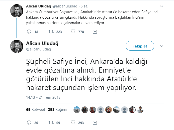 Safiye İnci Atatürk'e hakaret içeren bu videoyu paylaştıktan sonra, "yaa işte ben onu arkadaşıma göndermiştim. O benim haklarıma saygı duymadı, ben de onun haklarına saygı duymamak üzere böyle bir video hazırladım. Onun sosyal medyada yayınlayacağını bilemedim." şeklinde açıklamaları var. (Yersen)