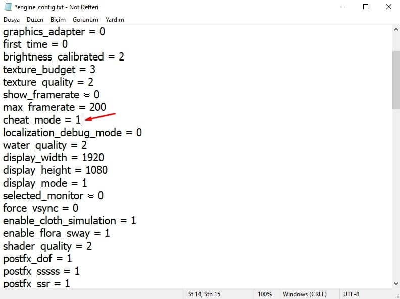 - Açtığınız not defterinde CTRL + F basarak arama kısmına cheat_mode = 0 komutunu bulun ve 0 yazan yeri 1 yazarak değiştirin.