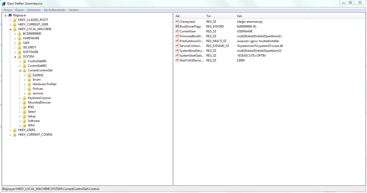 1-) Hatayı çözebilmek için kayıt defterine giriş yapmamız gerekiyor. Başlat ❱ Çalıştır ❱ Regedit yazarak kayıt defterine giriş yapıyoruz. Buradan HKEY_LOCAL_MACHINE ❱ System ❱ CurrentControlSet ❱ Control seçeneğine tıklayarak devam ediyoruz.