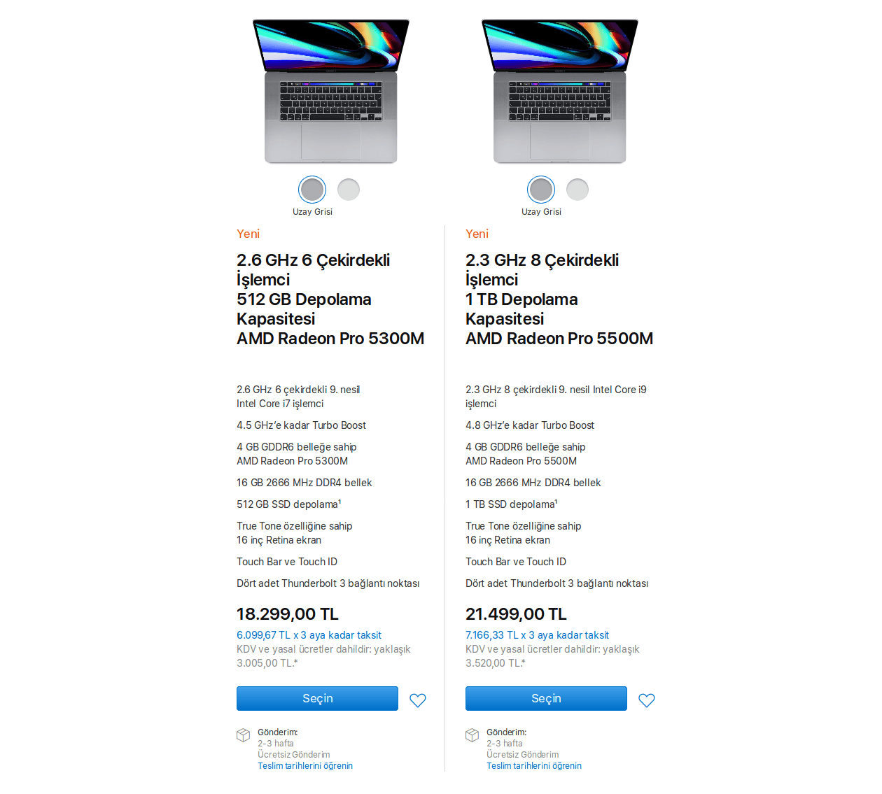 16-inçlik Macbook Pro cihazlarının özelleştirme yapılmamış fiyatları minimum 18.299 Türk Lirası (3 ay taksitle 6.099.67 TL) maksimum ise 21.499 Türk Lirası (3 aylık taksit ile 7.166.33 TL). Fiyatlara yaklaşık 3.000 ila 3.520 TL'lik KDV ve vergilerde dahildir. Cihazlarda Uzay Grisi ve Gümüş olmak üzere iki adet renk kapasitesi mevcut