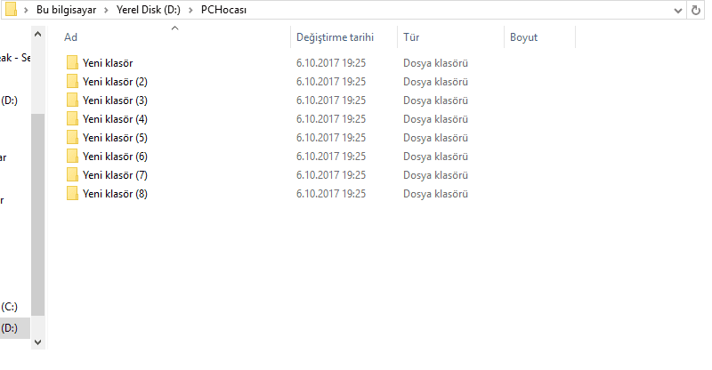 Başlamadan önde resimde görebileceğiniz üzere D:\PCHocası dizinine klasörler oluşturdum ve isimlerini Yeni Klasör olarak bıraktım.