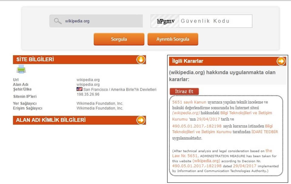 Zaten Wikipedia web sitesine erişmek istediğinizde 'bu web sitesine ulaşılamıyor' engeli ile karşılaşılıyor. BTK'nın 'site bilgileri sorgulama sayfası' bölümüne giriş yaparak siteyi sorgulattığınızda ise mahkeme kararı bulunmaksızın 'idari tedbir uygulanmaktadır' şeklinde bir açıklama bulunuyor.