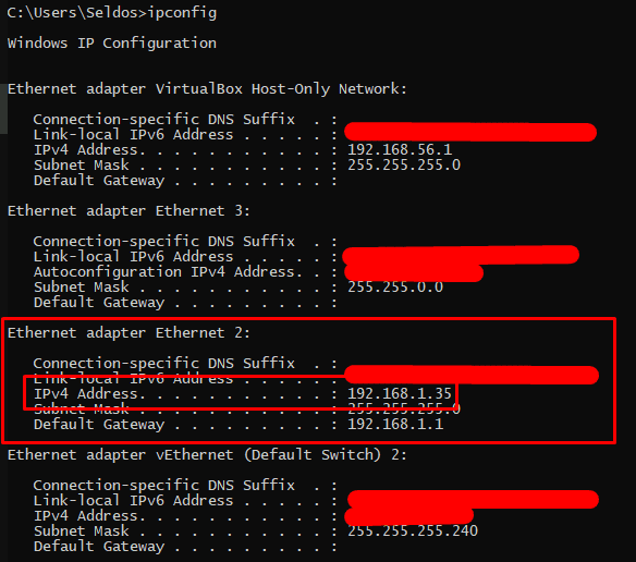 Benim ana kartımda 2 tane ethernet girişi var ama 1 tanesini kullanıyorum. Siz de kendi ethernet adaptörünüzü bulun ve IPv4 Address yazan satırın karşısındaki ip yi bir yere not edin.