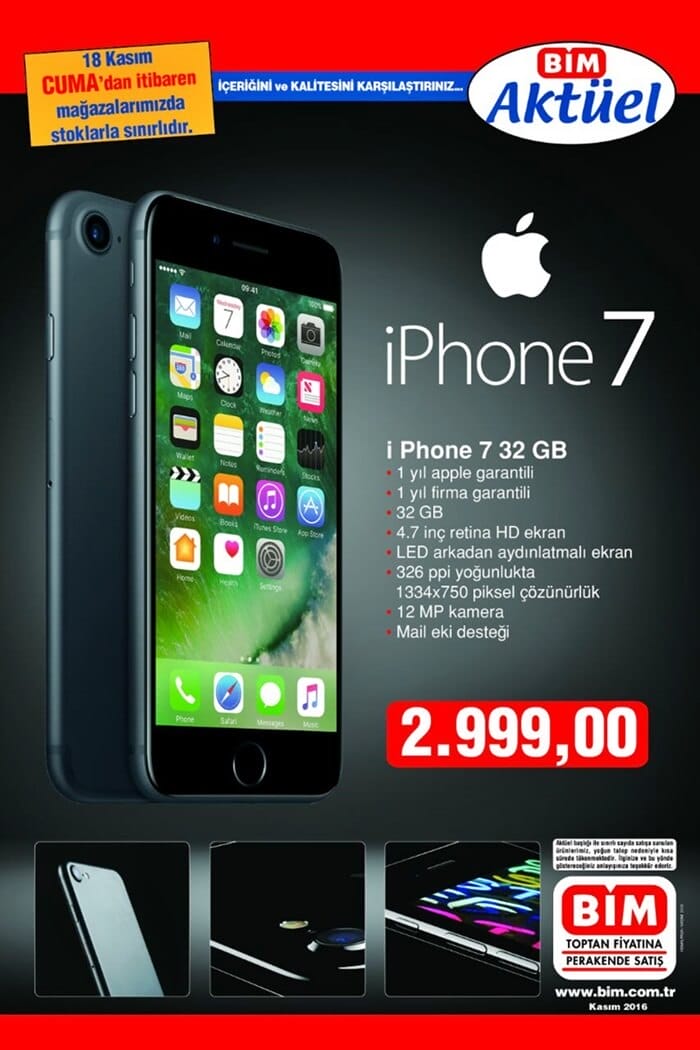 BİM deyince aklımıza direkt olarak "indirim" geliyor tabii ki. Uygun fiyatlı olarak sattıkları için her zaman tercih edilebilirliği yüksek olan firma, şuanda piyasada 3249 TL olan iPhone 7'yi 2999 TL'den satacak. Sınırlı sayıda getirilecek olan iPhone 7 modelleri 18 Kasım tarihinde stoklarda olacak.
