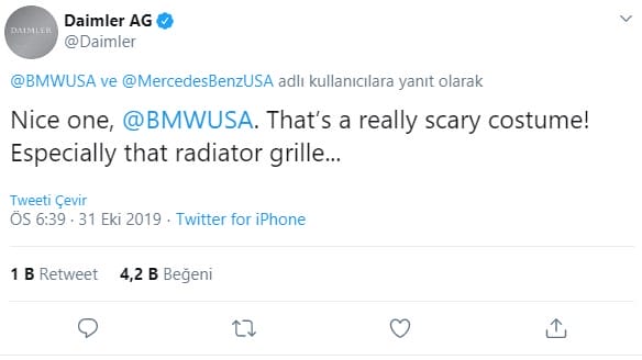 Bu paylaşıma Mercedes'in Twitter hesabından da bir o kadar güzel bir cevap verildi. “İyiydi. Bu gerçekten korkunç bir bir kostüm. Özellikle de radyatör ızgarası…” Tweeti ile cevap verildi.