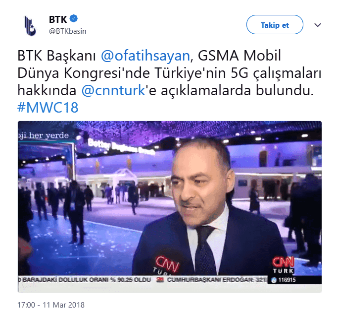 BTK Başkanı Ömer Fatih Sayan 5G teknolojisi hakkında açıklamalar yaparken, bu teknolojiyi kullanacak olan ilk 3 şehrin ismini de verdi. Hatta yaptığı diğer açıklamada "Biz 2023'te kendi milli şebekesi ile 5G'ye geçen ilk ülkelerden birisi olmak için bütün hazırlıklarımızı yapmaya devam ediyoruz. Bugün tüm bağlantılarımızı kuruyor ve operatörlerimize konular hakkında bilgilendiriyoruz. 5G konusunda Hacettepe, ODTÜ, Bilkent, Turkcell, Türk Telekom ve Vodafone ile birlikte 5G vadisi çalışmalarımız devam ediyor." dedi.
