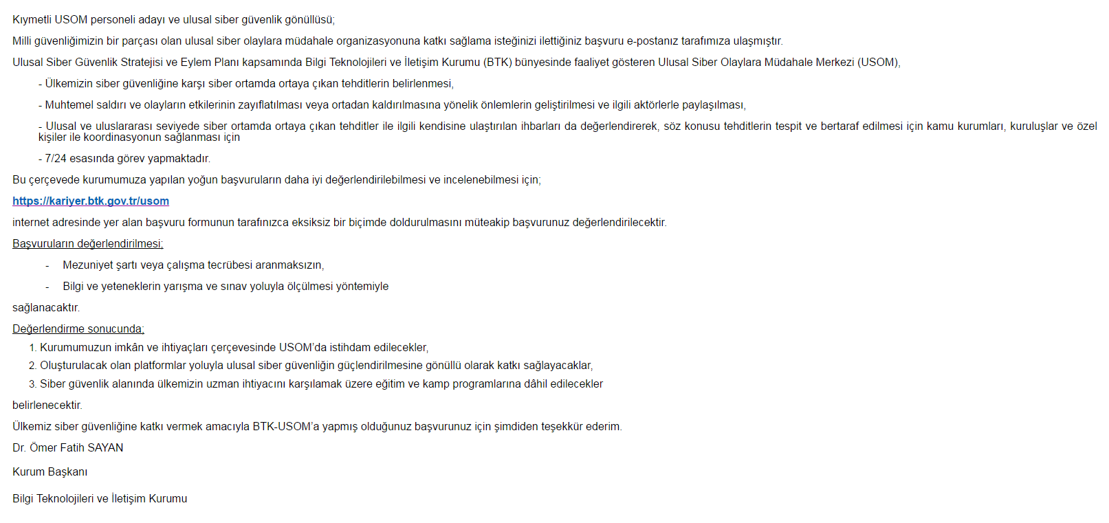 Geçtiğimiz hafta mail üzerinden başvuru gerçekleştiriliyordu arkadaşlar. Ancak mail olarak başvuran kişiler aşağıdaki gibi bir dönüş yapılıyor ve https://kariyer.btk.gov.tr/usom adresine girerek formu doldurmaları isteniyor.