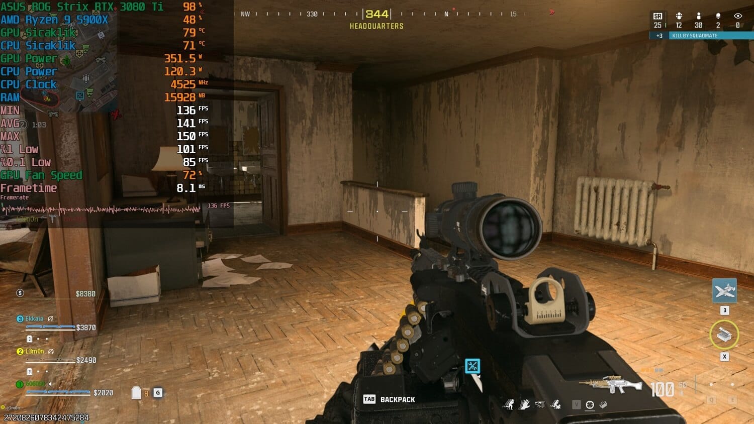 Aşağıdaki ilk görselde Afterburner yazılımı kullanarak aynı mekan ve aynı sahnede 141 ortalama FPS alıyorum. Bu sonuç FSR 3 açık değilken.