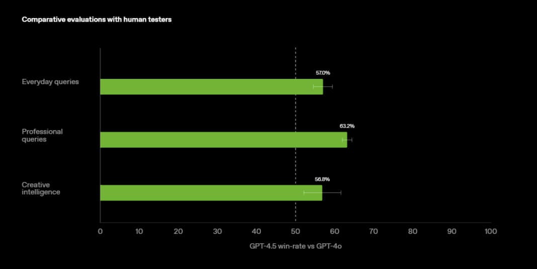 Test sonuçlarından ilerlediğimiz takdirde ChatGPT- 4.5, %56.8 başarı oranı ile 4o modelini geçmiş durumda. Günlük sorgu testlerinde %57.0 seviyesinde olan model, diğer versiyonlardaki gibi sorulan sorulara gereksiz uzunlukta cevaplar vermek yerine bilgilendirici, cevaplar sunacak.