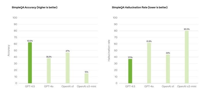 Modellerin basit bilgi sorularındaki başarı oranlarına göz attığımız zaman GPT-4.5, %62.5 doğruluk oranıyla birinci sırada yer alıyor. %38.2 ile yeni modelin arkasında GPT-4o aracı bulunuyor. GPT-4.5'in bir diğer önemli gelişmelerinden bir diğeri ise halisünasyon oranının %37.1 olması.