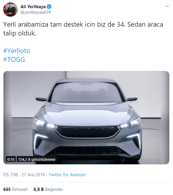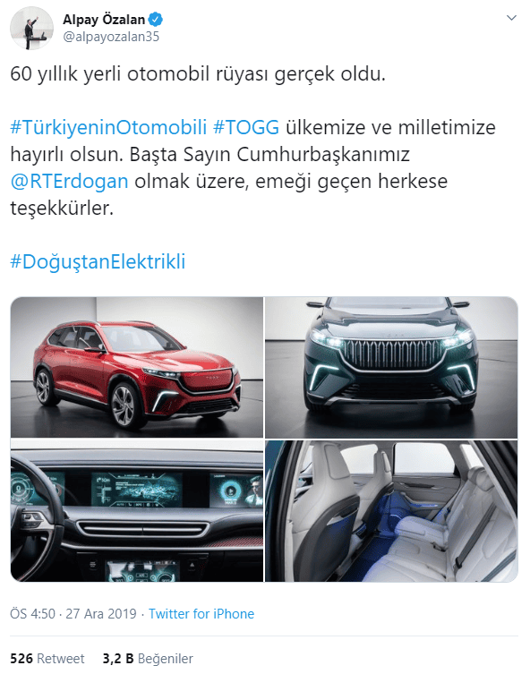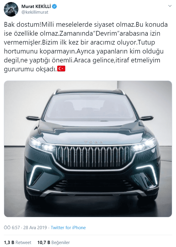 yerli otomobil hakkında övgüler ile bahsetti. Aynı zamanda araç ön siparişe açıldığı zaman ilk sipariş verecek kişilerden biri olduğunu belirtti.