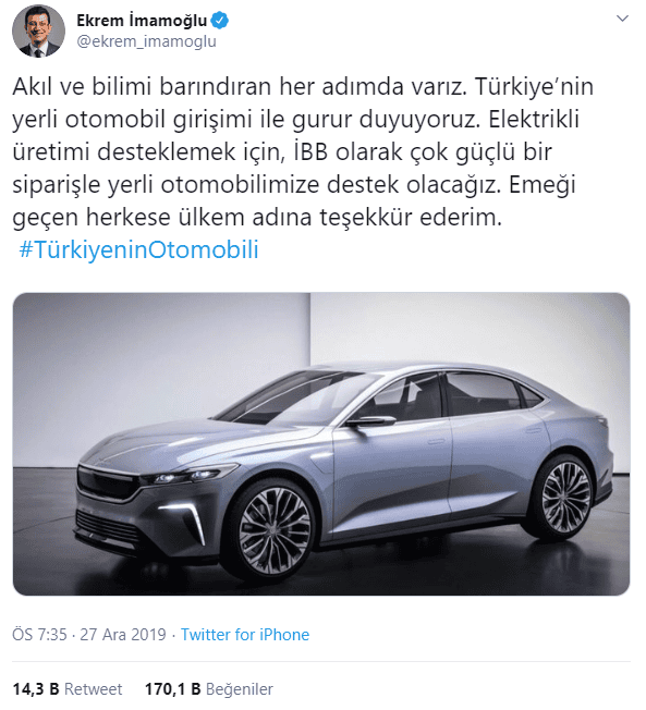 İstanbul Büyükşehir Belediye başkanı Ekrem İmamoğlu'da yerli otomobil hakkında övgü ile bahsedenlerden. Attığı tweet ile "Akıl ve Bilim barındıran her adımda varız. İBB olarak çok güçlü bir sipariş ile