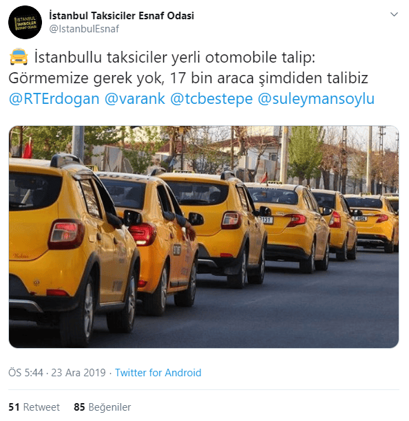 Belki de en fazla ön sipariş için söz veren odalardan bir tanesi İstanbul Taksiciler Esnaf Odası oldu. Yayınlanan bilgide İstanbul Taksiciler Esnaf Odası toplamda 17 bin adet