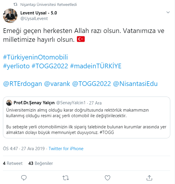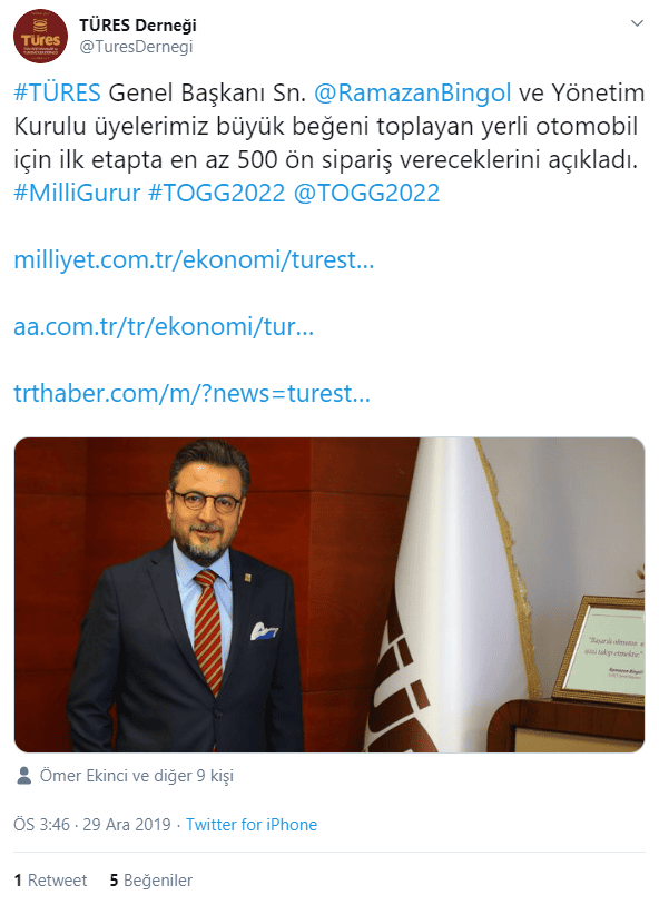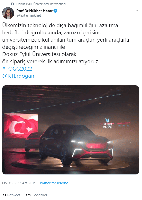 Yerli otomobil konusunda destek vereceklerini ve çıkar çıkmaz ön siparişte bulunacakları bilgisi rektör tarafından Twitter üzerinden paylaşıldı.