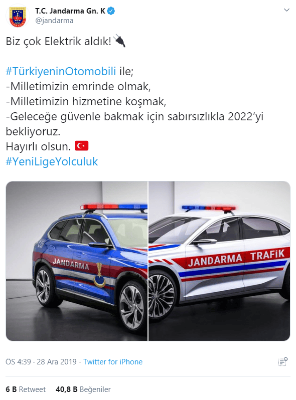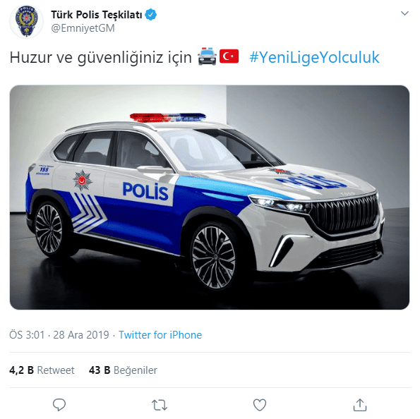 Belki de en güzel paylaşımı yapanlardan diyebilirim. Yerli otomobilin Photoshop ile tasarımı değiştirilip, Jandarma Genel Komutanlığı Twitter adresinden paylaşıldı ve binlerce like aldı. Açıklamada ise Komutanlığın yeni araç filosu için yerli otomobilleri tercih edileceği belirtildi.