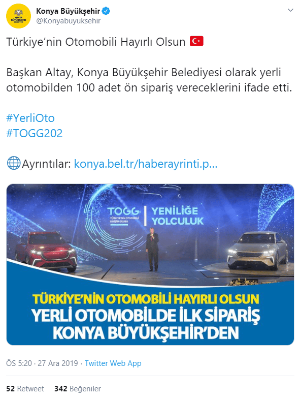 yerli otomobil için 100 adet sipariş vereceğini duyurdu.