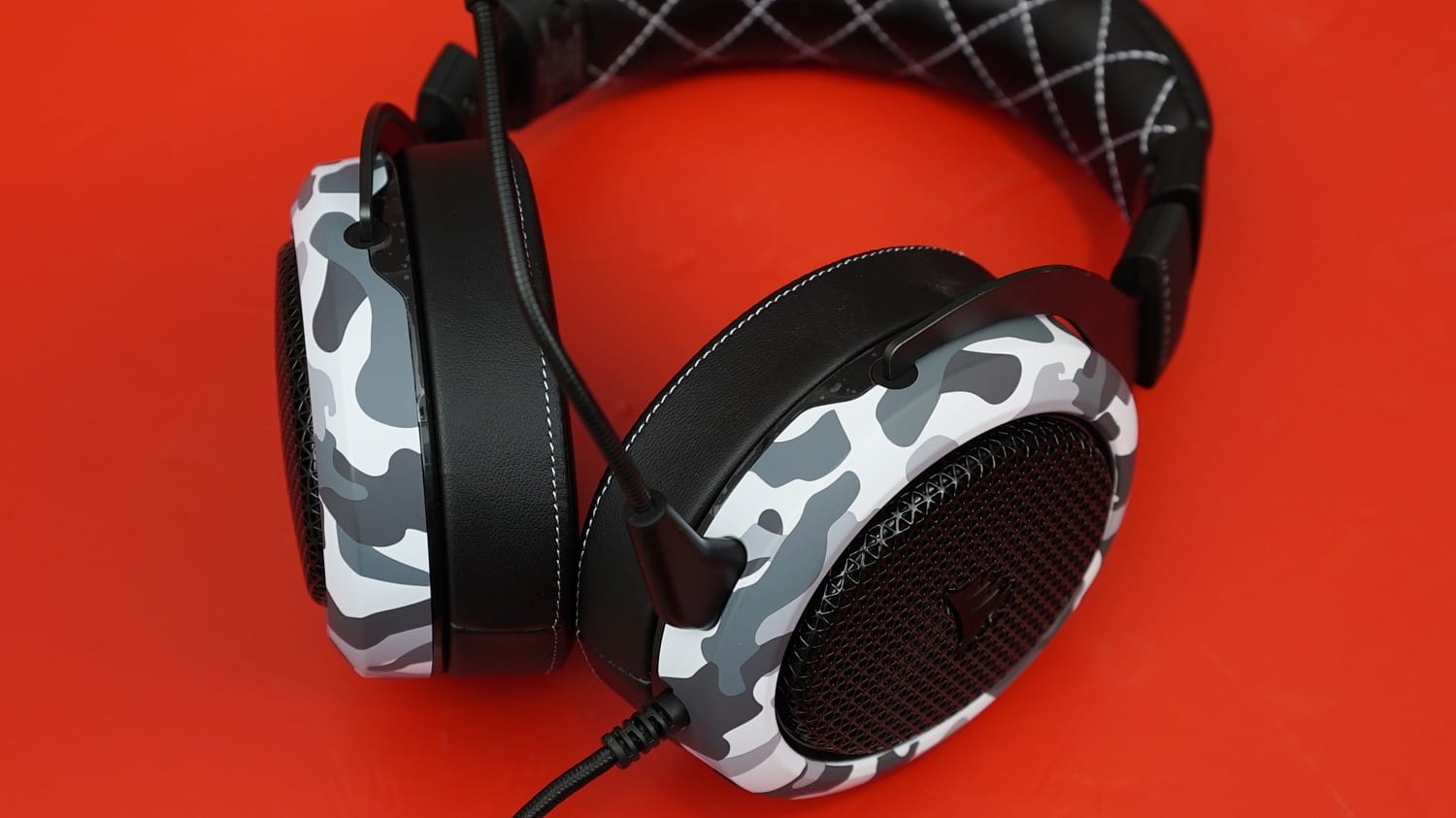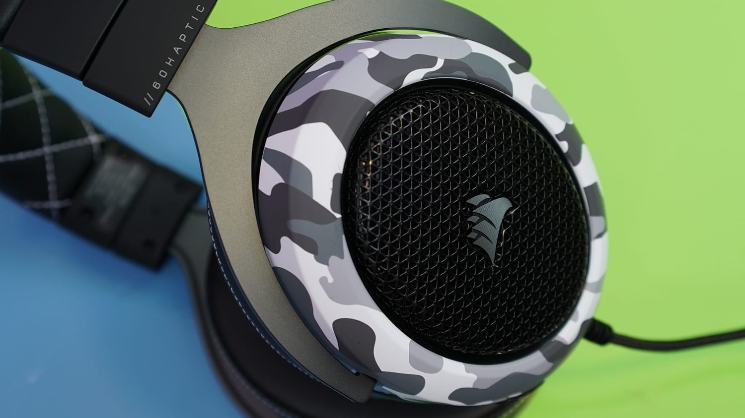 Corsair HS60 Haptic 7.1 kulaklık, alıştığımız sade tasarım çizgisinin dışına çıkarak kar kamuflajı tasarımı ile bizleri karşılıyor. Kulaklığın genel hatları siyah renk, sürücü kısımlarının etrafı ise kar kamuflajı deseni ile süslenmiş. Ayrıca kafa bandında beyaz çapraz dikişler yine bu tasarıma destek sunmuş. Malzeme tarafında alüminyum ve sert plastik malzemeler gördüğümüz kulaklık, dayanıklılık noktasında güçlü bir izlenim uyandırıyor.