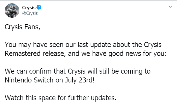 Crysis'in resmi Twitter hesabından yapılan açıklamaya göre oyun, Remastered sürümü olarak Nintendo Switch platformunda da boy gösterecek. Oyunun bu platforma çıkış tarihi ise 23 Temmuz Perşembe olarak belirlenmiş durumda.