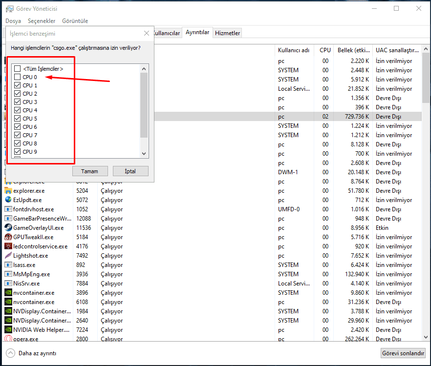 sadece CPU 0” olan seçeneğin tikini kaldırıp tamam diyorsunuz. Diğerlerinin hepsi tikli olacak