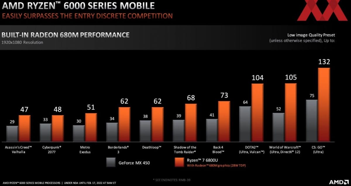 Testlere geçtiğimizde ise dahili Radeon 680M serisinin Ryzen 6800U işlemcinin içerisinde ilk olarak, GeForce MX 450 modeliyle karşı karşıya getirildiğini görüyoruz. Bu karşılaştırmada 28W TDP değerine sahip olan Radeon 680M net olarak önde. Cyberpunk 2077 oyunu gibi iddialı bir yapımda bile yeni dahili 680M GPU, daha iyi sonuçlar almış.