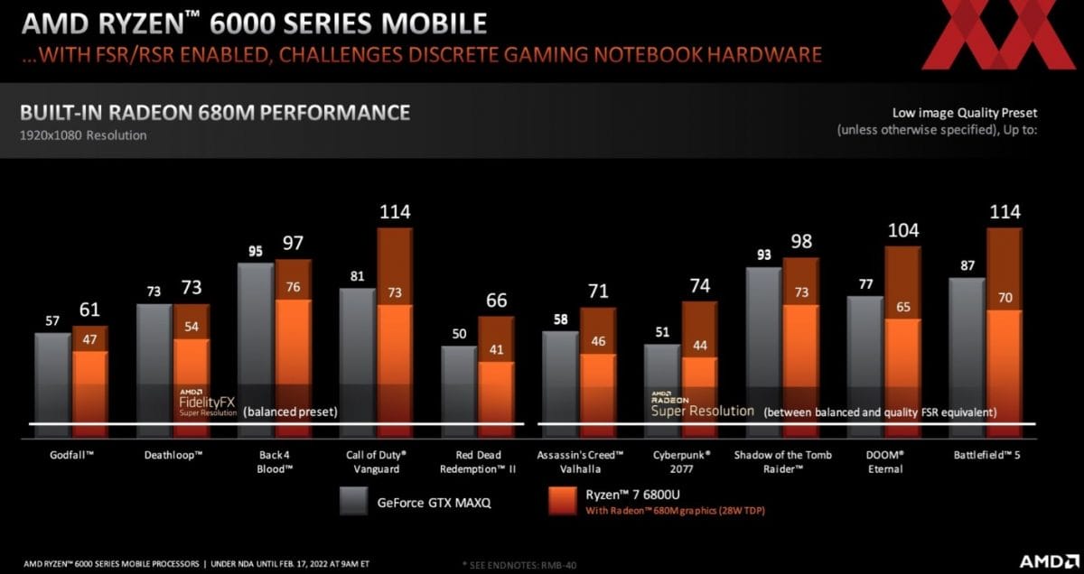 AMD FSR teknolojisini desteklemeleri. AMD FSR teknolojisi açıldığı zaman işler değişiyor. AMD’nin grafiklerine göre, yani dahili grafik birimi çok daha yüksek bir performans değerine çıkıyor ve Nvidia’nın modelini teste alınan hemen hemen her oyunda geçmeyi başarıyor.