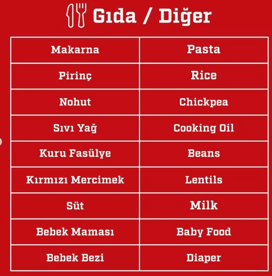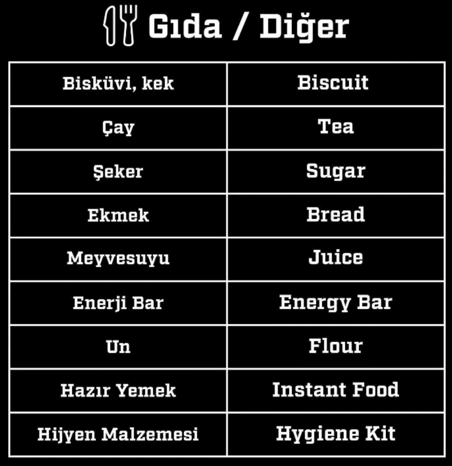 Lütfen sizde destekte bulunurken bu malzemelerin temel ihtiyaç malzemeleri olduğuna dikkat edin. Aşağıdaki görsellere göz atarak sizde temel ihtiyaç yardımında bulunabilirsiniz.