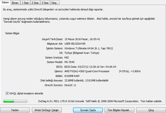 DirectX sürümünüzü Windows üzerinden kontrol etmek için Başlat ❱ Çalıştır ❱ Dxdiag yazarak Sistem sekmesinden kontrol edebilirsiniz. İlgili ekran görüntüsü aşağıdaki gibidir: