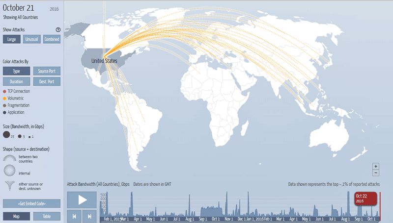 Malum geçtiğimiz günlerde yaşanan Rusya - ABD krizi iki devleti karşı karşıya getirmiş ve yapılan eleştiriler ile yorumlarda ipler gerilmişti. 21 Ekim tarihinde başlayan bu saldırı şuana kadar dünya genelinde yapılan en büyük saldırı olduğu belirtiliyor. Aşağıdaki ekran görüntüsünde de göreceğiniz üzere çok farklı IP adreslerinden milyonlarca zombi makine oluşturulmuş ve hepsi ABD'ye yönlendirilmiş olarak görünüyor.