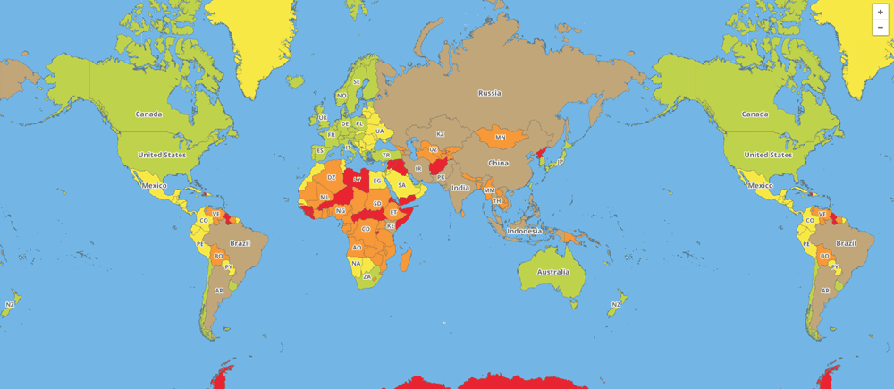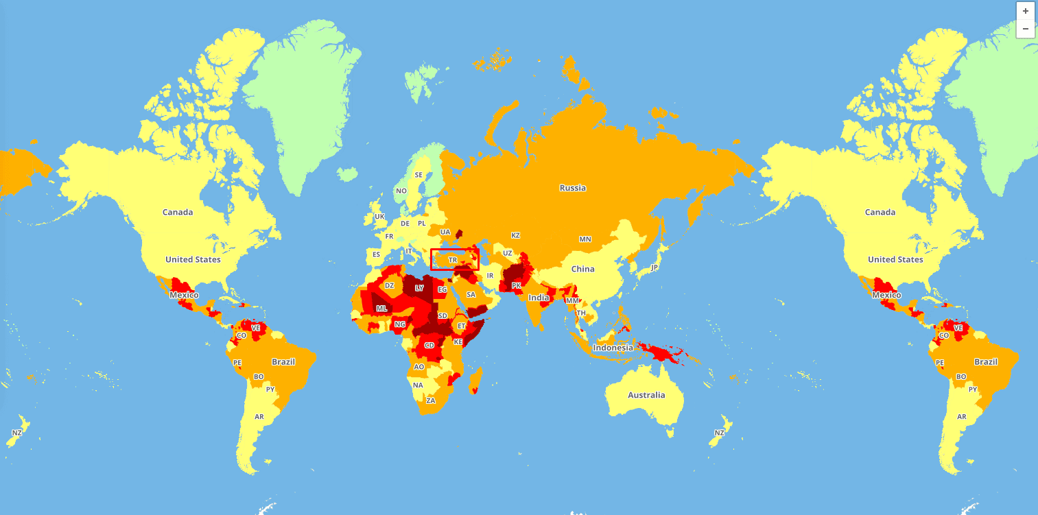 Haritada Türkiye'nin konumu şuanda 'turuncu' olarak işaretlenmiş durumda. Bunun bir tık üstü ise kırmızı yani 'güvensiz - tehlikeli' anlamına geliyor. Sınıra çok yakın olmamıza rağmen, turuncu olarak işaretleniyor olmamız çevre ülkelerde bizim de sınırlarımızı korumamız için gerçekleştirdiğimiz operasyonlardan tutun, terör saldırılarına ve 15 Temmuz gibi darbe girişimlerine kadar pek çok detay buralara ekleniyor ve puan düşülüyor.