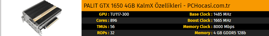 Palit GTX 1650 KalmX ekran kartı piyasaya fansız model olarak çok yakında çıkacak. Ayrıca en ucuz GTX 1650 ekran kartı olma niteliğini de yanında taşıyor.