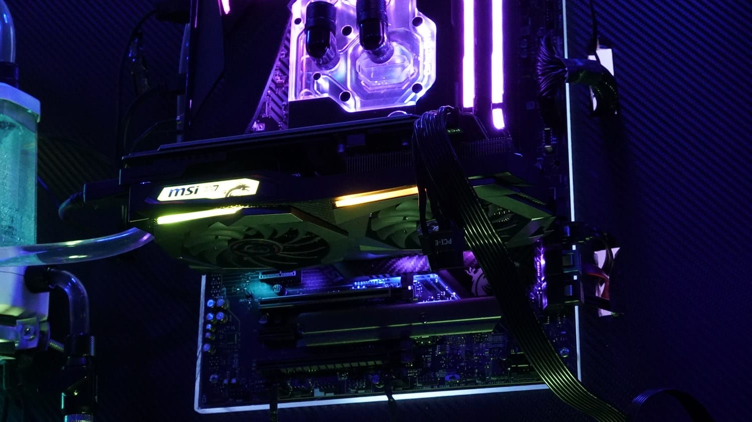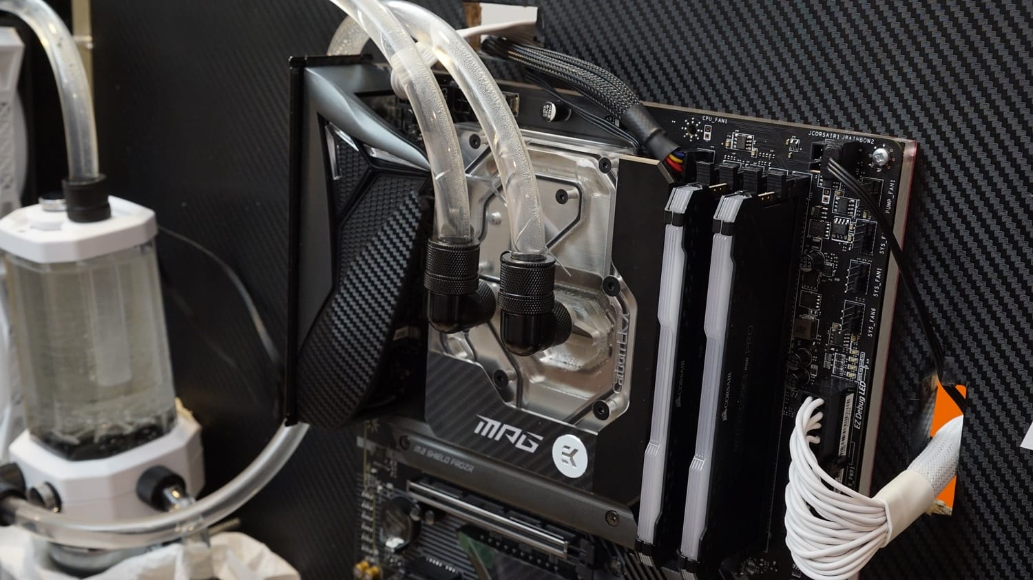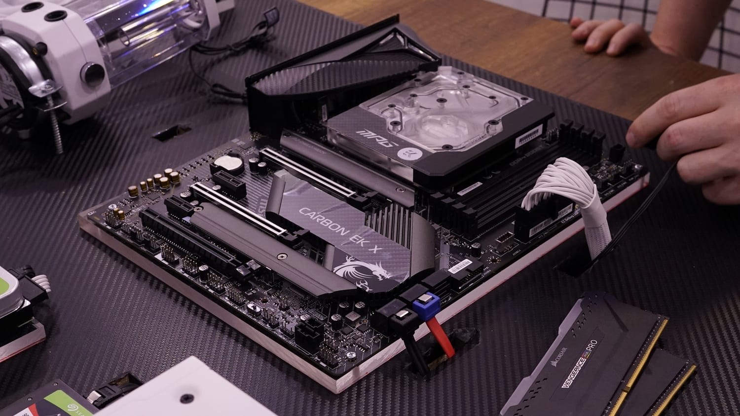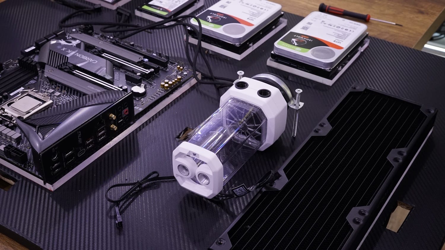 Delik açma işlemleri tamamlandıktan sonra sunta panelimizin çok daha estetik görünebilmesi amacıyla paneli tamamen karbon görünümlü kaplama ile kapladık. Daha sonra tüm parçaları şeffaf sert plastik bloklara ve o blokları da hazırladığımız sunta panele monte ettik. Montaj işlemi bir hayli zor oldu zira sıvı soğutma borularının ölçülüp uygun oranda kesilip birleştirilmesi son derece uğraştırıcı oldu. Aynı şekilde kabloların da hem görünmemesi hem de olası yanlış temas durumunda kısa devre yaratmaması adına da titiz bir çalışma yürüttük.