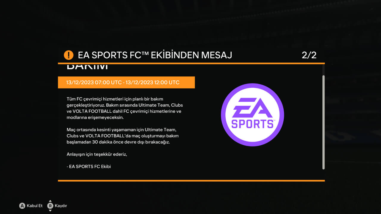 Sunucu bakım süresi içerisinde EA’nın çevrim içi modlarının yani Volta Football, Clubs ve Ultimate Team modlarına erişim sağlanamayacaktır.