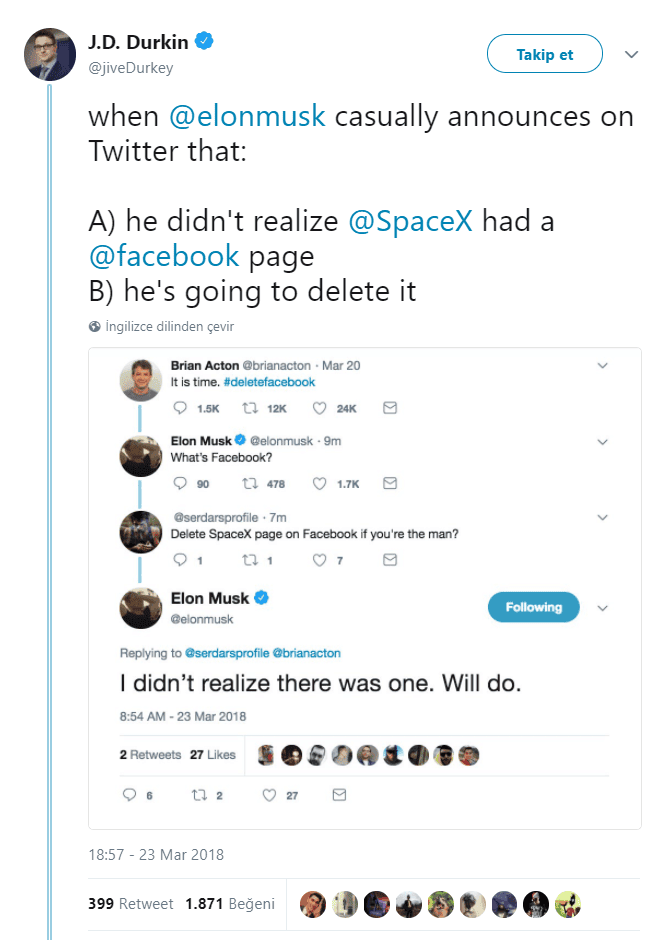 O da attığı Tweet ile "Facebook nedir?" diye cevap vererek adeta dalga geçtiler. Ardından bir Türk takipçi Serdar "Adamsan SpaceX Facebook hesabını sil" diyerek Elon'u bir nevi gaza getirdi. Sonrasında ise SpaceX ve Tesla Facebook sayfaları kalıcı olarak silindi. Türk bir kullanıcının gazına gelip bunu da yapması ayrı bir traji komik :)