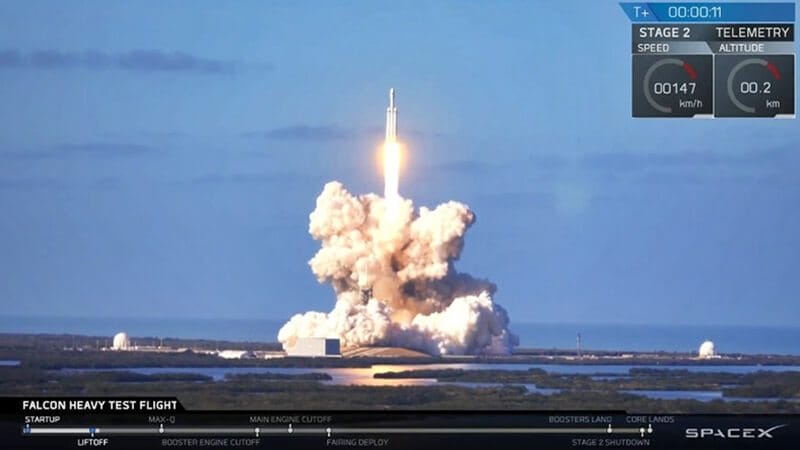 Uzay aracı ile birlikte gönderilen Tesla Roadstar'ın ise önemli bir özelliği vardı. Elon Musk kendi kullanmış olduğu şahsi aracını vererek böyle bir manyaklığa kalkıştı. Roket dünya atmosferinden ayrıldıktan sonra iki yan iticisi gövdesinden ayrıldı ve başarılı bir şekilde yörüngeye tırmanmış oldu.