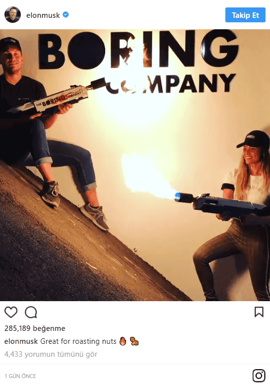 Alev makinesi şuanda Elon Musk'ın elinde bir oyuncak gibi duruyor ve çok eğlendiği görülüyor. Fakat işin ucunda alev olduğunu bir kez daha hatırlatmakta fayda var. Silahı ateşleyip ucundan alev çıkması insanları ne türde bir kafa ile eğlendirebilir düşünüyoruz açıkçası. Firma ürünün pazarlamasını yaparken de kızların elinde adeta baloncuk fırlatan bir tabanca edasında pazarlandığını görebilmek mümkün.