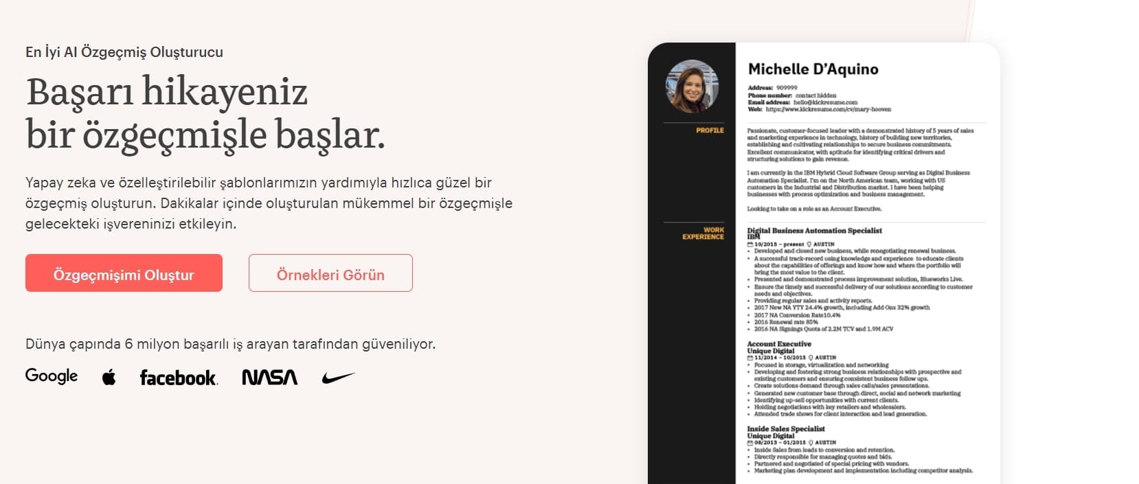 kickresume uygulama tarafından sorulan sorulara verdiğiniz yanıtlara göre özgün ve kişiye özel bir özgeçmiş hazırlayabiliyor.