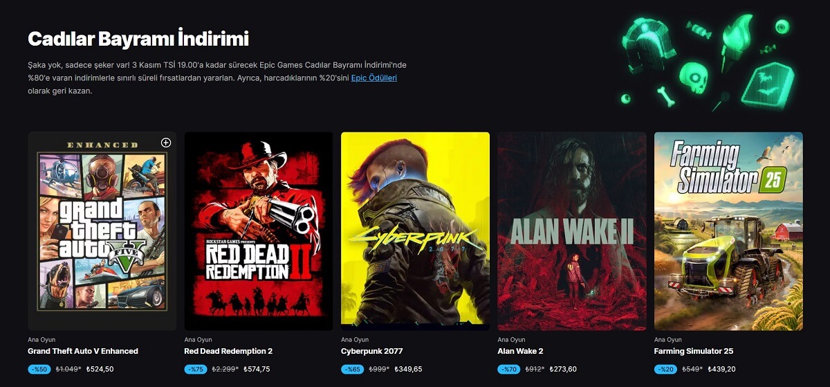Evet başlıca göze çarpan oyunları sizler için yukarıya listeledik. Ciddi bir indirimin söz konusu olduğunu dile getirebiliriz. Ek olarak, önemli bir detay daha bulunuyor. İndirim, 3 Kasım TSİ 19.00'a kadar sürecek. Oyun satın aldığınızda tutarın %20'si Epic ödülleri olarak hesabınıza geri iade edilecek.