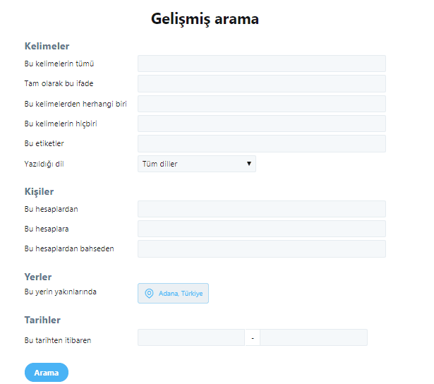 Herşey iyi güzelde bunlar size yetecek şeyler değil mi? Yada bazı nitelikleri birleştirerek arama mı yapmak istiyorsunuz; Twitter'ın kullanıma sunduğu Gelişmiş Arama sayfasına bir göz atmanızda fayda var.
