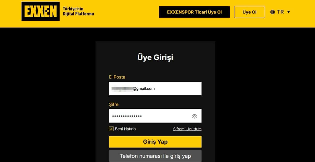 - Daha sonra "Üye Girişi" ekranından Exxen üyelik girişinizi yapın.