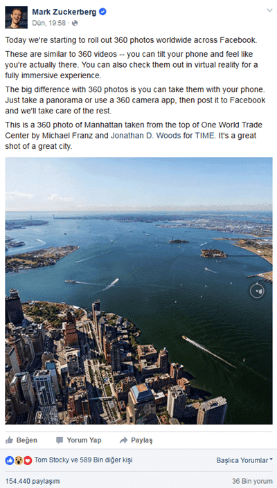 Facebook 360 Photos adı verilen yeni özellik şuan için sadece Mark Zuckerberg'in Facebook hesabına tanımlı durumda. Dün paylaştığı New York manzarası 360 derece olarak paylaşıldı. Telefonunuzu veya bilgisayardan mouseyi sağa sola ve yukarı aşağı hareket ettirerek görüntüleyebilme imkanı sunuyor.